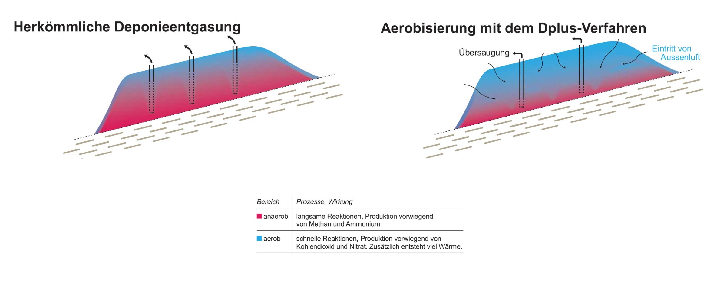 Ziel der Aerobisierung ist es, den Deponiekörper mit Sauerstoff zu durchsetzen und so die Abbauprozesse wieder zu beschleunigen. Im Gegensatz zu herkömmlichen Gasbrunnen werden beim patentierten Dplus-Verfahren Rohre, welche nur im untersten Bereich perforiert sind, in die Deponie abgeteuft.